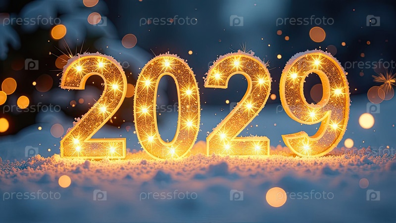 Прозрачные золотые светящиеся числа 2029 на снежном фоне Нового года с золотистыми гирляндами боке, секины, звезды, снег, блеск. Поздравления, открытка. Календарь, обложка. AI generated