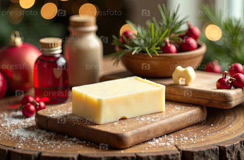 Ручно сделанное натуральное эко мыло на столе с бутылками с ароматизатором, красителем и основой для мыла на рождественском фоне. Подарок, подарок, ремесло на Новый год и Рождество. Производство любительского мыла, домашнее изготовление. ИИ генерируется;