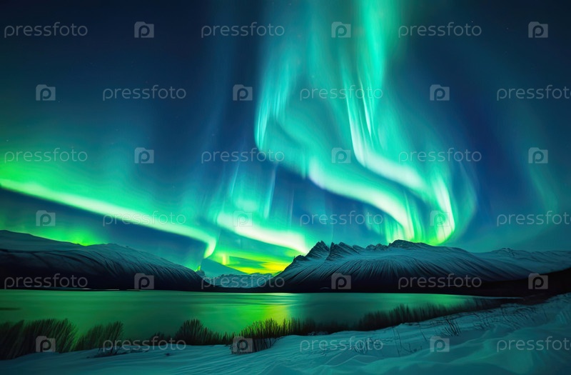 Северные огни в небе над северной снежной горной местностью зимой