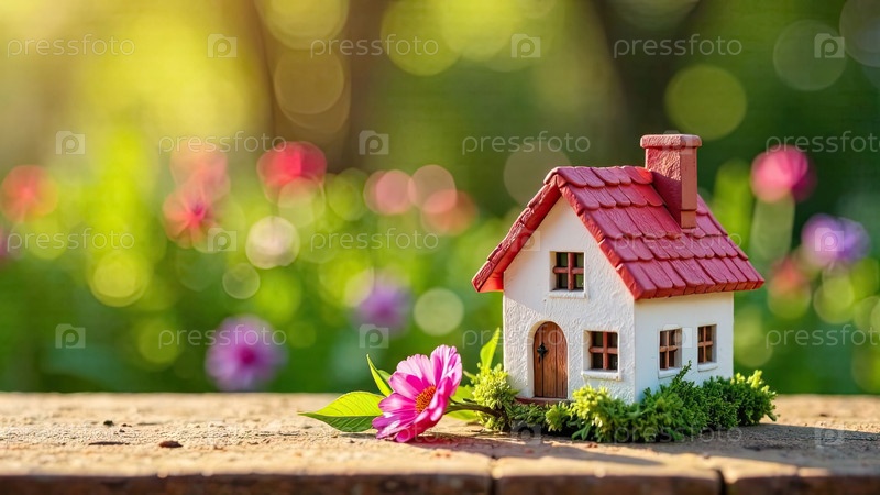 Крошечный дом стол с солнечным фоном весеннего цветения. недвижимость, риэлтор, ипотека, страхование, бронирование, строительство, изоляция. ИИ генерируется