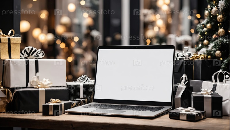 Ноутбук с белым экраном макет на столе в офисе рождественского декора с подарочными коробками для сотрудников, магазины, корпоративные подарки, Черная пятница,