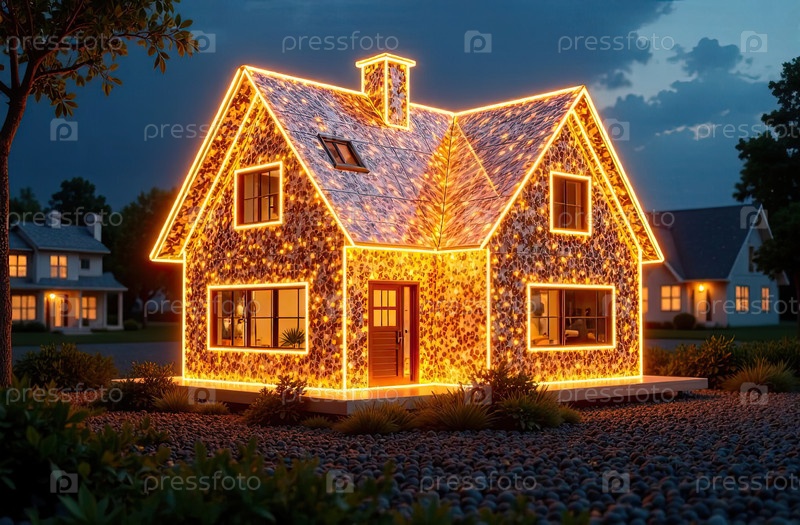 Прозрачное золото светящийся проект дома в натуральном размере на земельной площади. недвижимость, риэлтор, ипотека, страхование, здания, строительство, изоляция, отопление. ИИ генерируется