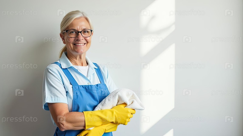 Портрет взрослой женщины в синем фартуке и желтых резиновых перчатках с тряпкой в руке у окна против белой стены, служба очистки окон, уборка дома