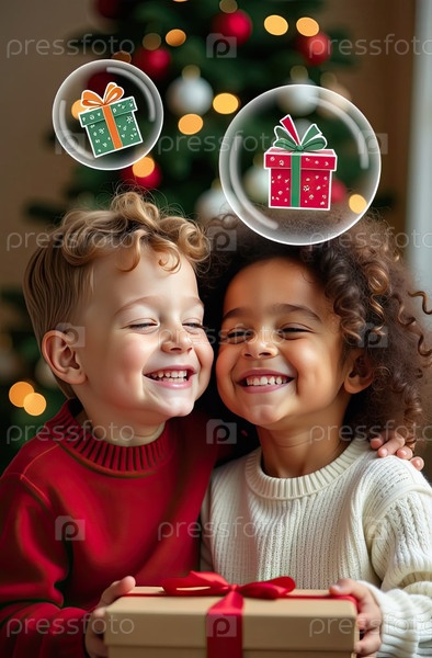 Круглые волосы мальчика и девочки в свитерах мечтают о подарках на Новый год - большие мультфильмы, нарисованные кругами со символами подарков внутри