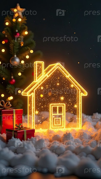 Прозрачное золото светящийся символ дома и коробка для подарков под елкой на рождественском фоне с золотым блеском