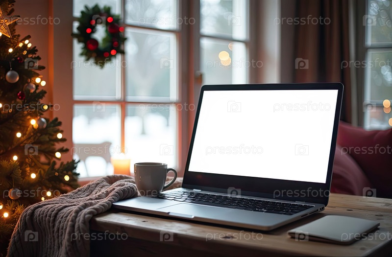 Ноутбук с белым экраном макет на столе в уютном домашнем офисе рождественского декора в стиле лофт