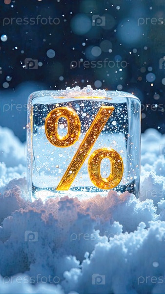 Неон светящийся золотой процентный знак в кубике льда на снежном фоне снаружи, блеск и снежинки Зимние распродажи и скидки, Черная пятница, Новый год, рождественский баннер, флаер. AI generated