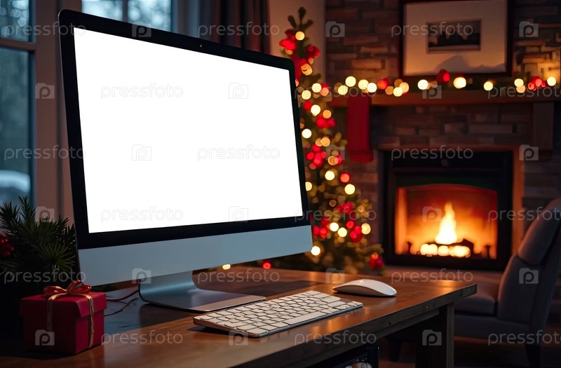 Монитор домашнего компьютера с белым экраном макет на столе в уютном домашнем офисе рождественского декора, елки и горящего камина с гирляндами