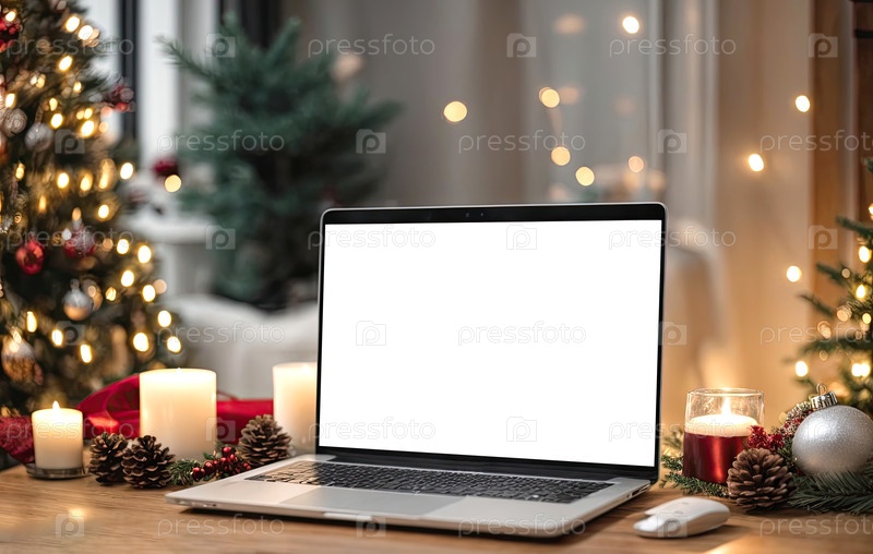 Ноутбук с белым экраном макет на столе на фоне рождественского декора комнаты с елкой, фейриными огнями, уютной комнатой