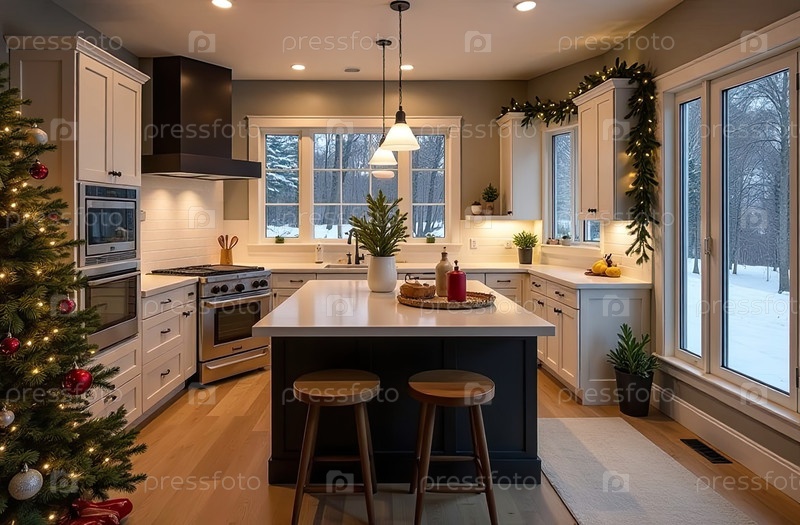 Белый интерьер уютной современной рождественской кухни, новогоднее настроение, подготовка к празднику, посуда. Рождественский декор современной кухни с приготовленным ужином. ИИ генерируется