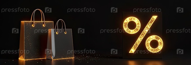 Неон светящийся золотой процентный знак на черном фоне. витрина магазина для Черной пятницы, распродажи, скидки, сумки для покупок. баннер, флаер. AI generated