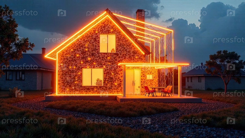 Прозрачное золото светящийся проект дома в натуральном размере на земельной площади. недвижимость, риэлтор, ипотека, страхование, здания, строительство, изоляция, отопление. ИИ генерируется