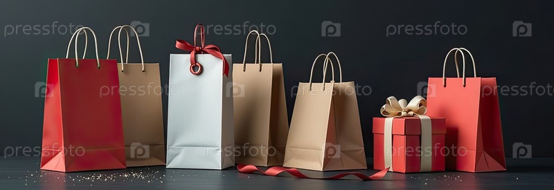 Ценник с пространством для текста на черном фоне. Покупки и скидки, распродажа в Черную пятницу, сумки покупок, подарочная коробка. баннер, флаер. ИИ генерируется