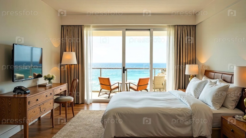 Интерьер гостиничного номера с видом на океан для пляжного отдыха и путешествий
