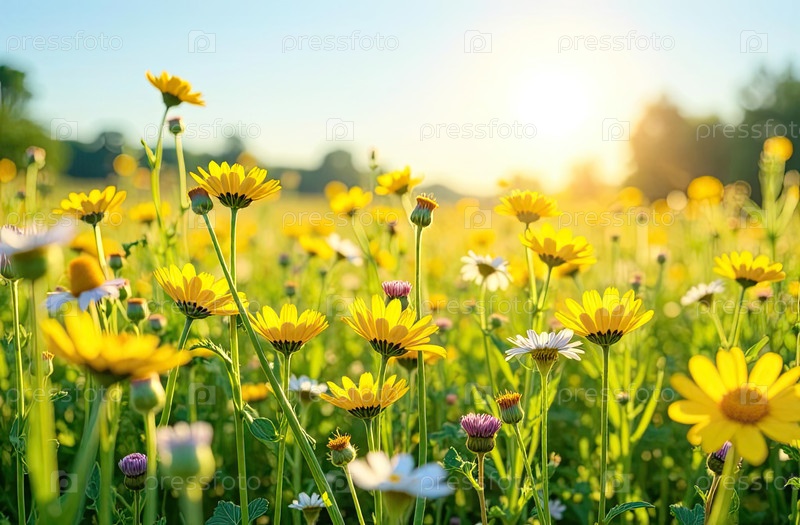 Пастбищный фон с дикими цветами, мягкий солнечный свет, зеленый и желтый градиент, идеально подходит для дизайна природы