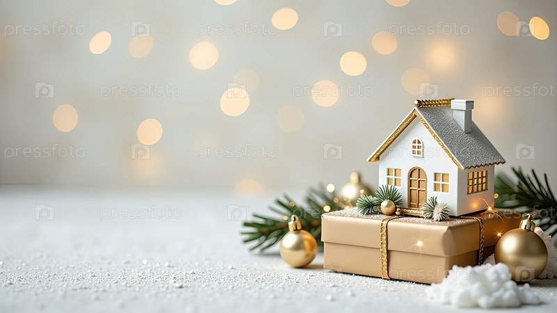 Золото-белый символический дом и подарочная коробка под рождественской елкой на столе Рождественский фон с золотым блестком на поздравительной карточке