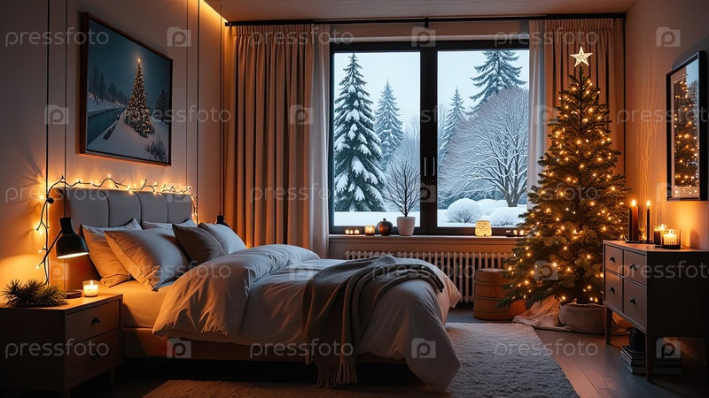 Уютная спальня с кроватью у окна с рождественским декором и елкой, теплыми гирляндами света и свечами - вид изнутри зимой и снегом. Отпразднуйте Рождество и Новый год, рождественское настроение. ИИ генерируется
