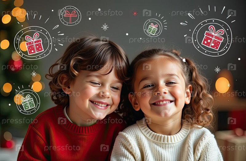 Круглые волосы мальчика и девочки в свитерах мечтают о подарках на Новый год - большие мультфильмы, нарисованные кругами со символами подарков внутри