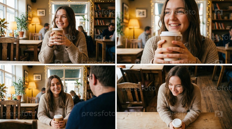 Коллаж людей, пьющих кофе вместе в уютном кафе, улыбающиеся лица, разговоры за столом, социальные моменты, наслаждение кофе, культура кафе