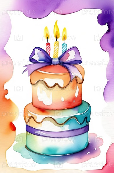 Многослойный торт с свечами, акварельный пастельный фон, праздничная иллюстрация, вертикальный баннер