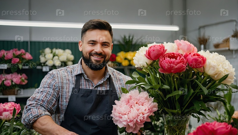 Бородатый европейский цветочник держит пышный букет бледных пион и роз для романтической доставки цветов