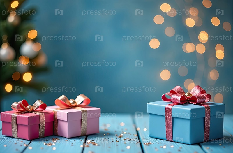 Рождественский фон с голубыми и розовыми коробками для подарков с лучами, светящимся боке и блеском. Праздничное настроение Карта на Рождество и Новый год с копировальным пространством. ИИ генерируется