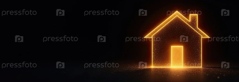 Прозрачное золото светящийся символ дома на черном фоне с золотым блеском. недвижимость, риэлтор, ипотека, страхование, бронирование, строительство, изоляция, отопление. AI generated