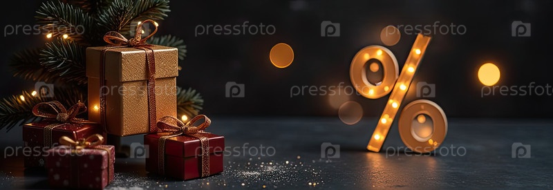 Неон светящийся золотой процентный знак на рождественском фоне с елкой, блесками и коробками для подарков. витрина магазина в Черную пятницу, Новый год, Рождественская распродажа, скидки. баннер, флаер. ИИ генерируется