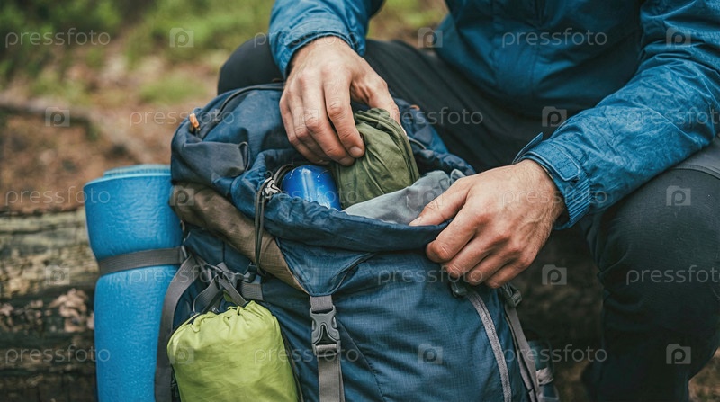 Взрослый упаковочный голубой рюкзак с трекинговым снаряжением на лесном грунте, подготовка к походам, приключениям на свежем воздухе, образ жизни путешествий, активное планирование