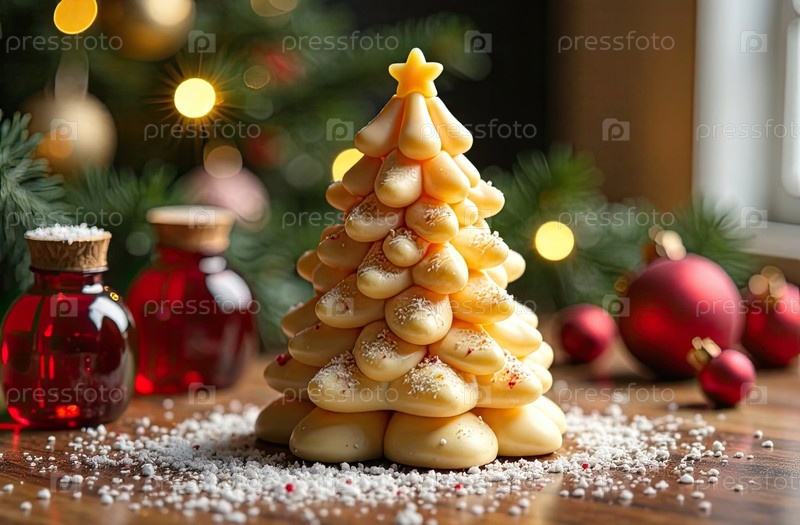 Ручная свеча в форме елки на рождественском фоне. Подарок, подарок, ремесло для Нового года и новогоднего подарка. Хоби-свечи и мыльное производство, домашнее изготовление. ИИ генерируется;