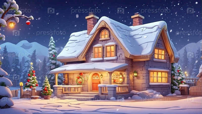 Мультфильм Уютный деревянный дом в горах ночью с рождественскими елками и подарками зимой на снегу и снегопаде с Рождественским декором - праздничная открытка