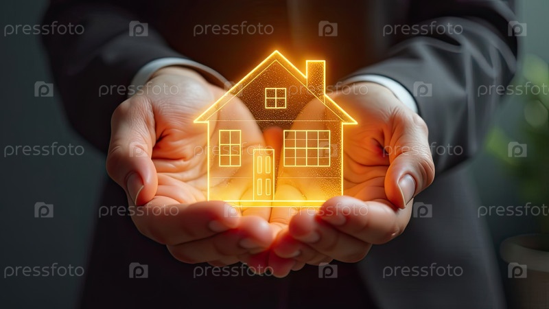 Золото светящийся символ уютного дома В ладонях рук с золотым блеском. Недвижимость, риэлтор, ипотека, страхование, бронирование, изоляция, мечта о собственном доме. ИИ генерируется