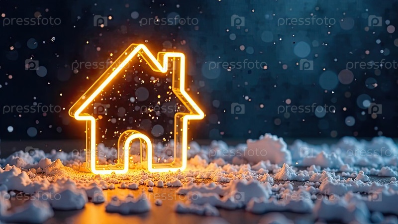 Прозрачное золото светящийся символ дома на снегу и заснеженном фоне с золотым блеском. недвижимость, риэлтор, ипотека, страхование, бронирование, зимовка, изоляция, отопление. ИИ генерируется