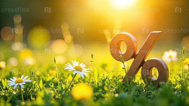 Процентный знак в солнечных лучах, украшен летними цветами. Летняя распродажа и скидки, экология, чистая природа, баннер летнего времени, флаер с копировальным пространством. ИИ генерируется