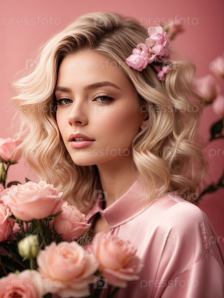 Кудрявая блондинка в розовой рубашке и цветах, весенний женский портрет, веселое цветочное настроение, День женщины