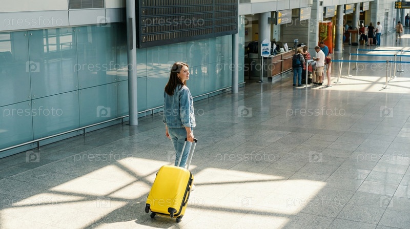 Женщина стоит с желтым чемоданом в пустом терминале аэропорта, ждет поездку, ожидание путешествия, начинается путешествие, прибытие на отдых