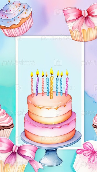 Торт и свеча на день рождения, вертикальная рамка акварели, шаблон карточки или плаката, открытая зона для пожеланий или текста