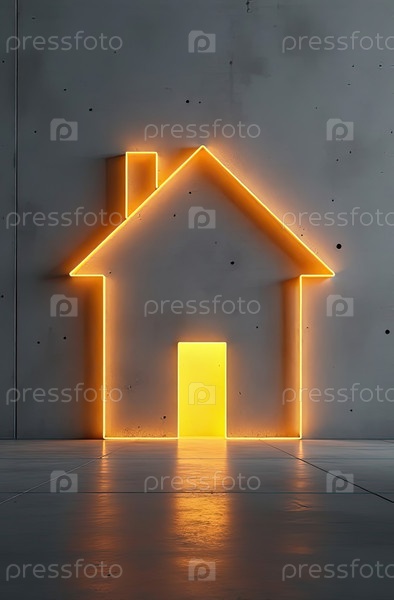 Прозрачное золото светящийся символ дома на сером бетонном фоне с золотым блеском. недвижимость, риэлтор, ипотека, страхование, бронирование, строительство, изоляция, отопление. ИИ генерируется
