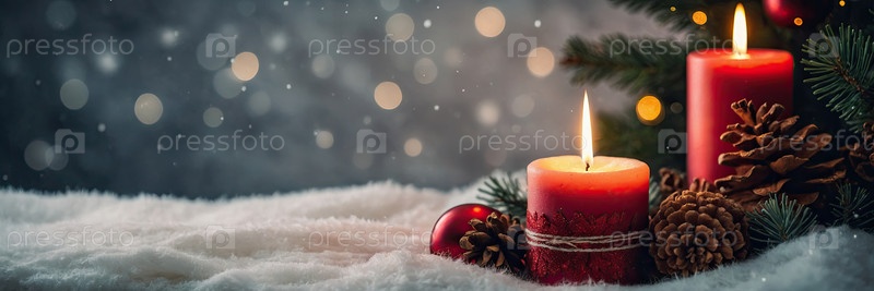 Рождественская открытка с кописпейсом на праздничном снежном фоне с елкой, рождественскими шарами, свечами, конусами и блеском
