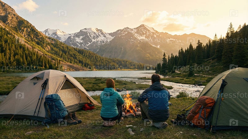 Палатки и люди отдыхают у горного озера на рассвете с живописными снежными вершинами, приключениями по кемпингу, путешествиями на свежем воздухе, утренней радостью