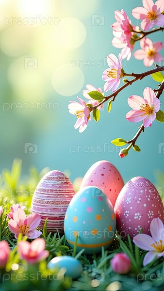 Пасхальные яйца украшены узорами, полосами, волнами, точками солнечных лучей, украшаются весенними пастельными цветами на весенне-синем фоне