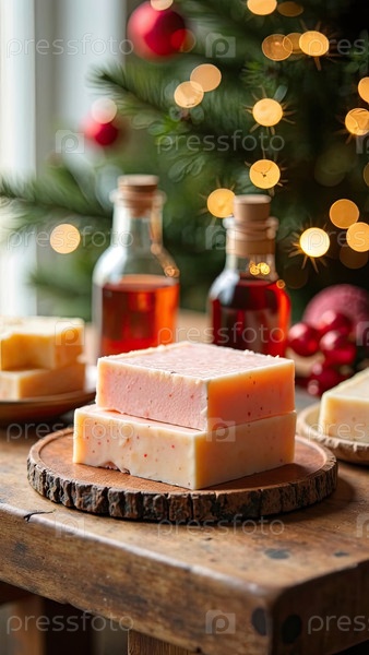 Ручно сделанное натуральное эко мыло на столе с бутылками с ароматизатором, красителем и основой для мыла на рождественском фоне. Подарок, подарок, ремесло на Новый год и Рождество. Производство любительского мыла, домашнее изготовление. ИИ генерируется;