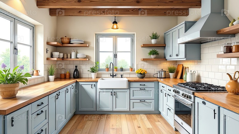 Белый интерьер уютной современной светлой деревенской кухни, горшечные растения, открытые полки для хранения посуды