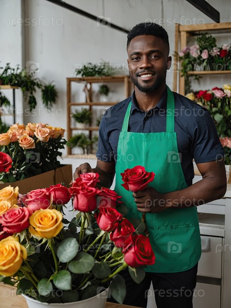 Улыбающийся чернокожий цветочник (краткие волосы) в магазине устраивает букет оранжевых и красных роз для дня рождения или романтического заказа