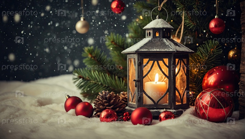 Рождественская открытка с кописпейсом на праздничном снежном фоне с елкой, рождественскими шарами, свечами, конусами и блеском