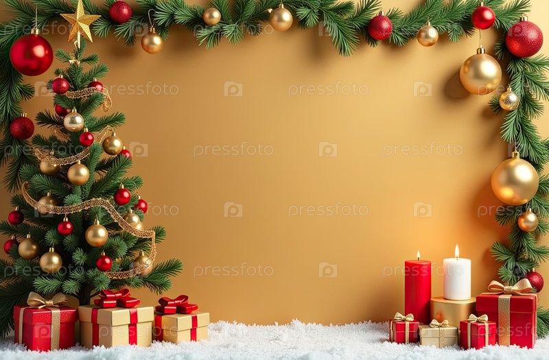 Рождественские поздравительные открытки приглашение с пространством для текста в раме на золотом фоне со светящейся рождественской елкой и гирляндой, шарами, подарочными коробками