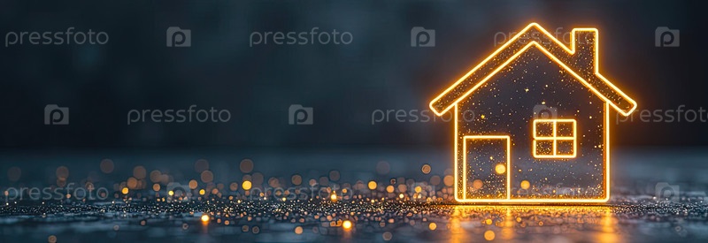 Прозрачное золото светящийся символ дома на сером бетонном фоне с золотым блеском. недвижимость, риэлтор, ипотека, страхование, бронирование, строительство, изоляция, отопление. ИИ генерируется