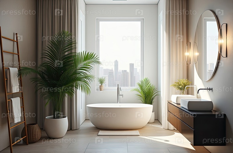 Ванная комната в стиле лофт с окном, большие горшечные растения, круглое зеркало. дизайн интерьера. современный ИИ генерируется