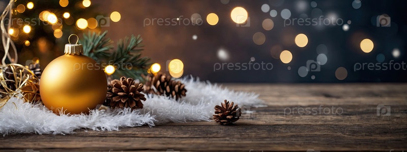 Рождественская открытка с кописпейсом на уютном деревянном столе с елкой, рождественскими шарами, свечами, конусами и блестками