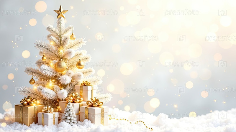 Акварельная белая и золотая рождественская елка и коробки для подарков на сияющем фоне. поздравительная карточка на Рождество и Новый год с копировальным пространством. созданный ИИ